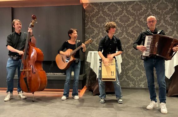 Four born musicians play guitar, flute, double bass, cajon and accordion and also sing in four voices. We move from table to table or from group to group and the audience is involved in the act without being intrusive. We play completely acoustically with small individual voice amplifiers if necessary.