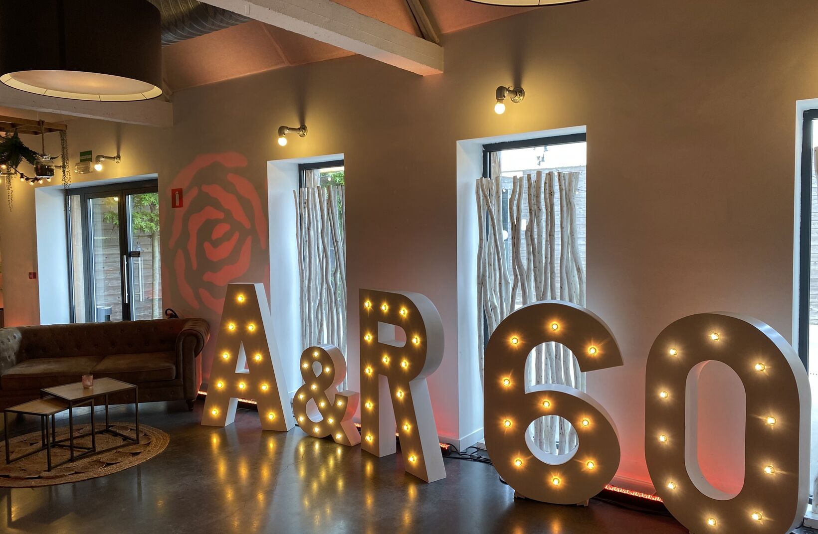 For André and Rachel's sixtieth wedding anniversary, we provided this setup with a combination of classic seating (crossbacks and round tables), standing tables with bar stools and a velvet lounge. Rose was the target color.